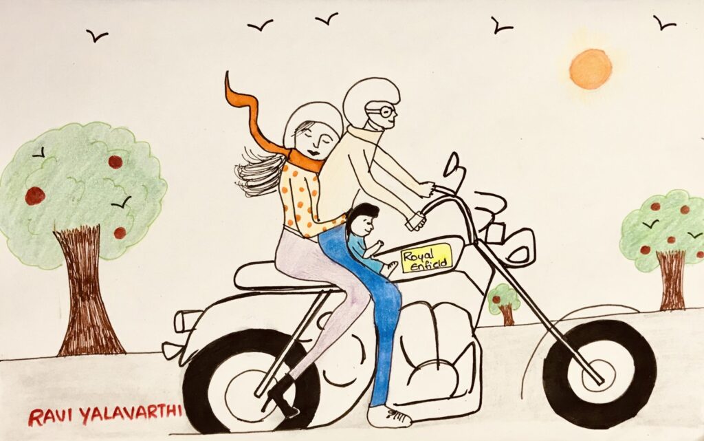 My father kick-started the bike and rav the engine. Though I am used to that dug-dug sound a few times from my baby cradle in the living room. I didn’t listen to that sound this near and louder. At first, I stopped crying with shock by listening to that big sound of that machine I always wanted to stand upon. My Mom and I hopped on the bike, and my Mom held me in her hands super protectively.